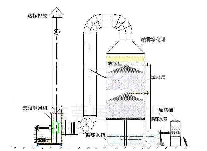 四、電鍍廢氣處理方案流程:電鍍廢氣經(jīng)負(fù)壓收集進(jìn)入酸性洗滌塔,被噴淋的堿液吸收,從而去除酸性氣體,經(jīng)過處理后的氣體由煙囪排出。