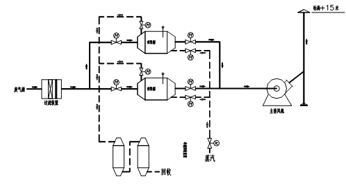 3、脫附氣體流程:脫附系統(tǒng)主要是與吸附器相連的飽和水蒸汽調(diào)節(jié)與分配系統(tǒng)。吸附后的吸附材料通過自力式調(diào)壓閥減壓后的蒸汽使其增溫,將吸附濃縮在活性炭纖維層上的重芳烴脫附下來,同時(shí)依靠蒸汽的吹掃,將含有水蒸氣和有機(jī)溶劑的混合蒸汽吹出,送入回收系統(tǒng)。