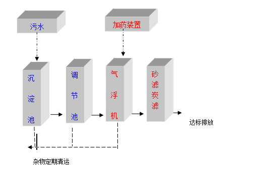 上海機(jī)加工含油清洗廢水工藝流程圖及工藝描述:沉淀池預(yù)處理+氣浮機(jī)(加藥)+砂濾碳濾工藝。