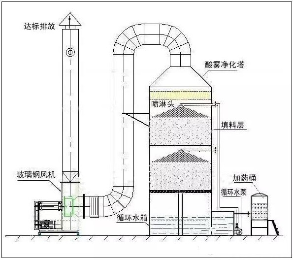 酸霧廢氣噴淋塔(洗滌塔)用于廢氣凈化處理。通常采用氫氧化鈉容易為吸收中和液來凈化酸霧廢氣,要求噴淋塔(洗滌塔)廢氣凈化設(shè)備具備良好的耐酸堿防腐蝕性質(zhì)。